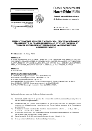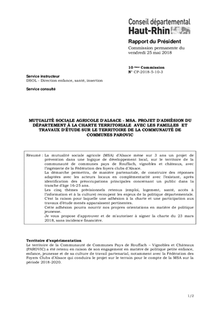 MUTUALITÉ SOCIALE AGRICOLE D'ALSACE - MSA. PROJET D'ADHÉSION DU DÉPARTEMENT À LA CHARTE TERRITORIALE AVEC LES FAMILLES ET TRAVAUX D'ÉTUDE SUR LE TERRITOIRE DE LA COMMUNAUTÉ DE COMMUNES PAROVIC