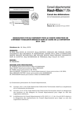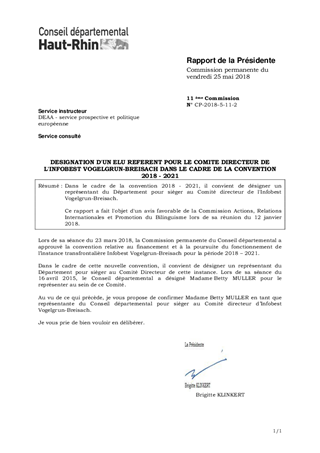 Dans le cadre de la convention 2018 - 2021, il convient de désigner un représentant du Département pour siéger au Comité directeur de l'Infobest Vogelgrun-Breisach. Ce rapport a fait l'objet d'un avis favorable de la Commission Actions, Relations Internationales et Promotion du Bilinguisme lors de sa réunion du 12 janvier 2018.
