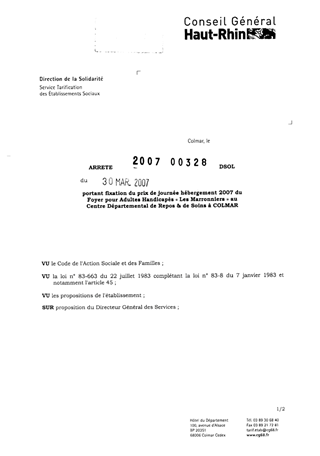 portant fixation du prix de journée hébergement 2007 du foyer pour adultes handicapés "Les Marronniers" au centre départemental de repos et de soins à COLMAR. Resumé Pièces jointes ARRETE Assemblée : Non défini Date : 30/03/2007 Rapporteur : Non défini Collectivité : Conseil départemental du Haut-Rhin Direction : Non défini Service : Service de la Tarification des Etablissements Domaine : Prix de Journée Commission :