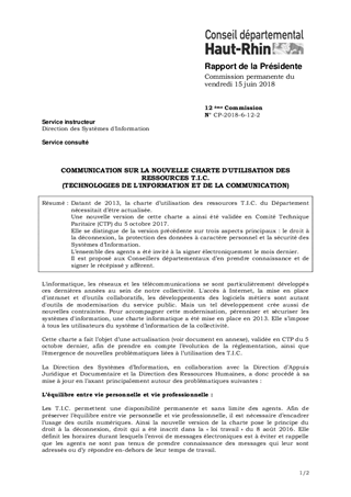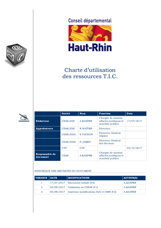 Datant de 2013, la charte d’utilisation des ressources T.I.C. du Département nécessitait d’être actualisée. Une nouvelle version de cette charte a ainsi été validée en Comité Technique Paritaire (CTP) du 5 octobre 2017. Elle se distingue de la version précédente sur trois aspects principaux : le droit à la déconnexion, la protection des données à caractère personnel et la sécurité des Systèmes d’Information. L’ensemble des agents a été invité à la signer électroniquement le mois dernier. Il est proposé aux Conseillers départementaux d’en prendre connaissance et de signer le récépissé y afférent.