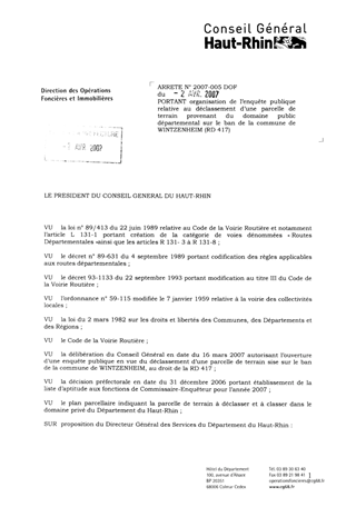 portant organisation de l'enquête publique relative au déclassement d'une parcelle de terrain provenant du domaine public départemental sur le ban de la commune de WINTZENHEIM (RD 417). Resumé Pièces jointes ARRETE Assemblée : Non défini Date : 02/04/2007 Rapporteur : Non défini Collectivité : Conseil départemental du Haut-Rhin Direction : Non défini Service : Service du Patrimoine et du droit des Sols Domaine : Déclassement de voirie Commission :