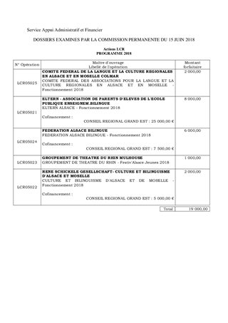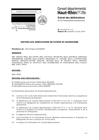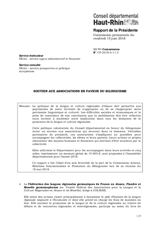 La politique de la langue et culture régionales d'Alsace doit permettre aux populations de notre territoire de s'approprier ou de se réapproprier notre patrimoine linguistique et culturel. Les difficultés sociales et économiques et la prise de conscience de nos concitoyens que la mobilisation doit être collective nous incitent à maintenir notre implication dans tous les domaines de la promotion de la langue et culture régionales. Cette politique volontariste du Conseil départemental en faveur du bilinguisme inclut un soutien aux associations qui œuvrent dans ce domaine. Véritables partenaires de proximité, ces associations s’impliquent au quotidien pour accompagner les collectivités, les élèves et leurs parents. Leurs actions et projets nécessitent des moyens humains et financiers qui méritent d’être soutenus par la collectivité. Elles sollicitent le Département pour les accompagner dans leurs activités et cinq aides, représentant un montant global de 19 000 €, sont proposées à l’Assemblée départementale pour l’année 2018. Ce rapport a fait l’objet d’un avis favorable de la part de la Commission Actions, Relations Internationales et Promotion du Bilinguisme lors de sa réunion du 18 mai 2018.