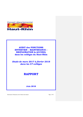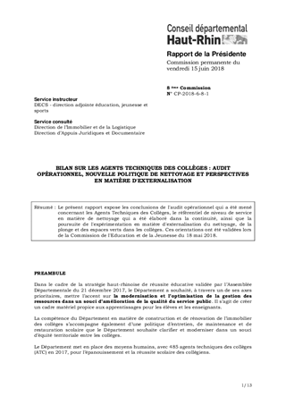 Le présent rapport expose les conclusions de l'audit opérationnel qui a été mené concernant les Agents Techniques des Collèges, le référentiel de niveau de service en matière de nettoyage qui a été élaboré dans la continuité, ainsi que la poursuite de l'expérimentation en matière d'externalisation du nettoyage, de la plonge et des espaces verts dans les collèges. Ces orientations ont été validées lors de la Commission de l'Education et de la Jeunesse du 18 mai 2018.
