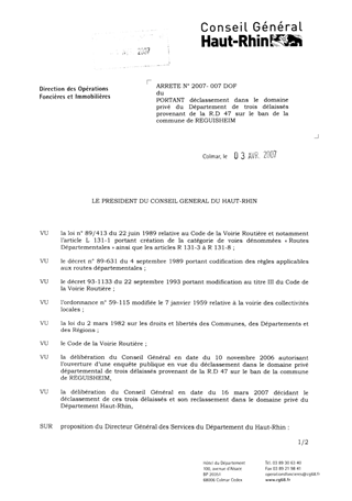 portant déclassement dans le domaine privé du Département de trois délaissés provenant de la RD 47 sur le ban de la commune de REGUISHEIM. Resumé Pièces jointes ARRETE Assemblée : Non défini Date : 03/04/2007 Rapporteur : Non défini Collectivité : Conseil départemental du Haut-Rhin Direction : Non défini Service : Service du Patrimoine et du droit des Sols Domaine : Déclassement de voirie Commission :