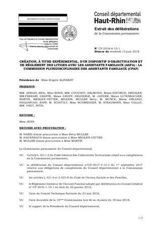 Le Département emploie 230 assistants familiaux (ASFA) au 31 décembre 2017 qui accueillent 418 enfants confiés au Service de l’Aide Sociale à l’Enfance (ASE). Certaines situations, heureusement peu fréquentes, sont particulièrement difficiles à vivre pour les ASFA et leur entourage et requièrent une objectivation avec des regards croisés, une distanciation, une écoute et un accompagnement adéquat. Il s’agit du traitement des informations préoccupantes (IP) relatives à l’accueil d’enfants chez un ASFA. Par ailleurs, la gestion de différends qui surviennent de manière récurrente entre l’ASE et l’ASFA sur le nombre d’enfants confiés par rapport aux places d’agrément nécessite également un espace de dialogue et d’arbitrage dépassant le seul périmètre de l’ASE. Il est proposé la mise en place, à titre expérimental pour un an, d’un dispositif d’objectivation et de règlement des litiges pour les ASFA centré sur la gestion des IP et le règlement de différends récurrents avec l’ASE, au travers d’une commission regroupant des représentants des ASFA du Haut-Rhin et des représentants du Département : la Commission Pluridisciplinaire des Assistants Familiaux.