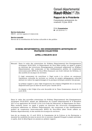 Dans le cadre des orientations du Schéma Départemental des Enseignements Artistiques 2018/2023, le Département du Haut-Rhin publie un appel à projets en direction des structures d’enseignements artistiques adhérentes au Schéma Départemental, des communes et des établissements publics de coopération intercommunale (EPCI) du Haut-Rhin finançant une école relevant du Schéma, et des sociétés de musique du territoire. Il s’agit notamment de contribuer à l’égal accès à la culture en soutenant l’animation culturelle du territoire au travers de projets pédagogiques collectifs mettant en valeur les apprentissages et la pratique artistique amateur des jeunes. Le présent rapport a pour objet d'approuver les critères d'éligibilité de ce nouveau dispositif ainsi que sa mise en œuvre pour l’année 2019. Ce dossier a fait l’objet d’un avis favorable de la 7ème Commission réunie le 13 avril 2018.