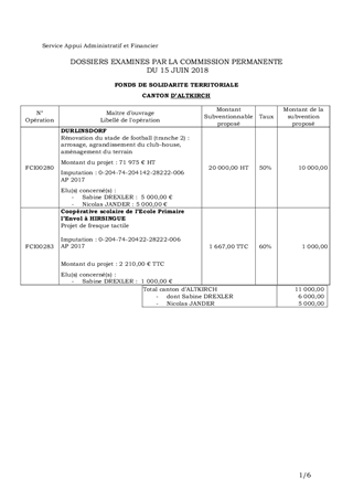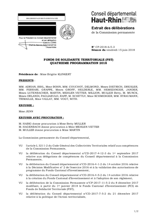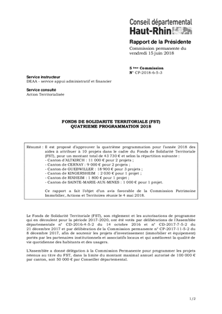 Il est proposé d’approuver la quatrième programmation pour l’année 2018 des aides à attribuer à 10 projets dans le cadre du Fonds de Solidarité Territoriale (FST), pour un montant total de 43 730 € et selon la répartition suivante : - Canton d’ALTKIRCH : 11 000 € pour 2 projets ; - Canton de CERNAY : 9 000 € pour 2 projets ; - Canton de GUEBWILLER : 18 900 € pour 3 projets ; - Canton de KINGERSHEIM : 2 030 € pour 1 projet ; - Canton de RIXHEIM : 1 800 € pour 1 projet ; - Canton de SAINTE-MARIE-AUX-MINES : 1 000 € pour 1 projet. Ce rapport a fait l’objet d’un avis favorable de la Commission Patrimoine Immobilier, Actions et Territoires réunie le 4 mai 2018.
