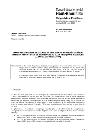 Dans le cadre du présent rapport, il est proposé d'approuver la Convention du Programme d'Intérêt Général (PIG) partenarial du Département du Haut-Rhin «Habiter Mieux 68» sur la période du 1er juillet 2018 au 30 juin 2023 et d'autoriser la Présidente du Conseil départemental du Haut-Rhin à la signer. Ce rapport a fait l'objet d'un avis favorable de la Commission Solidarité, Famille, Insertion et Logement lors de sa réunion du 18 mai 2018.