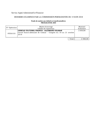 Dans le cadre du Fonds de soutien aux initiatives transfrontalières (FSIT), il est proposé de subventionner le Cercle franco-allemand de Colmar Centre Alsace (CFACCA) à hauteur de 2 500 euros pour l’organisation du congrès annuel des associations franco-allemandes à COLMAR qui se tiendra du 18 au 21 octobre 2018. Ce rapport a fait l’objet d’un avis favorable de la Commission Actions, Relations internationales et Promotion du Bilinguisme lors de sa réunion du 18 mai 2018.