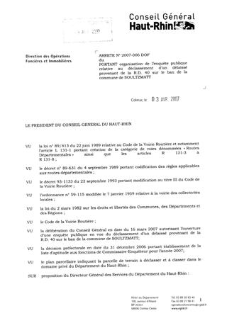 portant organisation de l'enquête publique relative au déclassement d'un délaissé provenant de la RD 40 sur le ban de la commune de SOULTZMATT. Resumé Pièces jointes ARRETE Assemblée : Non défini Date : 03/04/2007 Rapporteur : Non défini Collectivité : Conseil départemental du Haut-Rhin Direction : Non défini Service : Service du Patrimoine et du droit des Sols Domaine : Déclassement de voirie Commission :