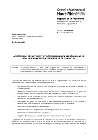 ADHÉSION DU DÉPARTEMENT ET DÉSIGNATION D'UN REPRÉSENTANT AU SEIN DE L'ASSOCIATION TERRITOIRES ET HABITAT 68