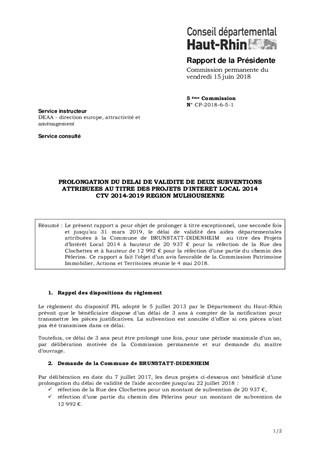 Le présent rapport a pour objet de prolonger à titre exceptionnel, une seconde fois et jusqu’au 31 mars 2019, le délai de validité des aides départementales attribuées à la Commune de BRUNSTATT-DIDENHEIM au titre des Projets d’Intérêt Local 2014 à hauteur de 20 937 € pour la réfection de la Rue des Clochettes et à hauteur de 12 992 € pour la réfection d’une partie du chemin des Pèlerins. Ce rapport a fait l’objet d’un avis favorable de la Commission Patrimoine Immobilier, Actions et Territoires réunie le 4 mai 2018.