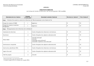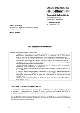 Le présent rapport a pour objet : - d’approuver la création et la suppression d’un certain nombre d’emplois afin de permettre la réorganisation de la Direction de la Solidarité (DSOL), ainsi que la mise en œuvre de la phase opérationnelle du Syndicat Mixte du Bassin de l'Ill ; - d’autoriser, en cas d’échec de la procédure statutaire, le recrutement d’agents contractuels pour un certain nombre d’emplois inscrits au tableau des emplois ; - d’approuver les modalités concrètes de mise en œuvre du vote électronique pour les prochaines élections professionnelles ; - de décider la prolongation de l’expérimentation du télétravail selon les modalités fixées dans votre délibération du 23 juin 2017 ; - d’arrêter la liste des emplois bénéficiaires d’un avantage en nature au titre de l’année 2018 ; - de fixer les nouveaux ratios d’avancement de grade pour les cadres d’emplois de catégorie C suite à l’application du protocole d’accord Parcours Professionnels, Carrière et Rémunération (PPCR) ainsi que ceux relatifs au cadre d’emplois des sages-femmes ; - de vous communiquer le bilan de formation 2017 ainsi que le plan de formation pour l’année 2018.