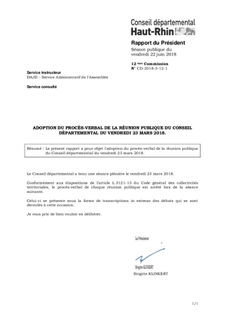 Le présent rapport a pour objet l'adoption du procès-verbal de la réunion publique du Conseil départemental du vendredi 23 mars 2018.