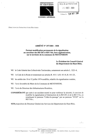 Portant modification de la signalisation au carrefour des RD 201 et RD 3 bis, hors agglomération sur le territoire de la commune de Meyenheim Resumé Pièces jointes ARRETE Assemblée : Non défini Date : 16/10/2001 Rapporteur : Non défini Collectivité : Conseil départemental du Haut-Rhin Direction : Non défini Service : Direction des Routes Domaine : Circulation Commission :
