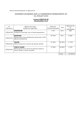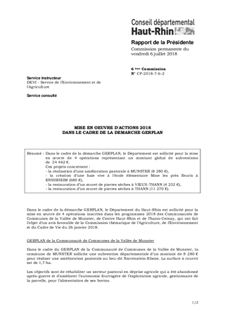 Dans le cadre de la démarche GERPLAN, le Département est sollicité pour la mise en œuvre de 4 opérations représentant un montant global de subventions de 24 462 €. Ces projets concernent : - la réalisation d’une amélioration pastorale à MUNSTER (8 280 €), - la création d’une haie vive à l’école élémentaire Mine les prés fleuris à ENSISHEIM (680 €), - la restauration d’un muret de pierres sèches à VIEUX-THANN (4 232 €), - la restauration d’un muret de pierres sèches à THANN (11 270 €).