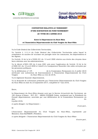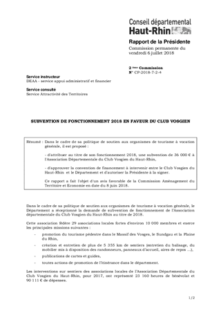 Dans le cadre de sa politique de soutien aux organismes de tourisme à vocation générale, il est proposé : - d'attribuer au titre de son fonctionnement 2018, une subvention de 36 000 € à l'Association Départementale du Club Vosgien du Haut-Rhin, - d'approuver la convention de financement à intervenir entre le Club Vosgien du Haut-Rhin et le Département et d'autoriser la Présidente à la signer. Ce rapport a fait l'objet d'un avis favorable de la Commission Aménagement du Territoire et Economie en date du 8 juin 2018.