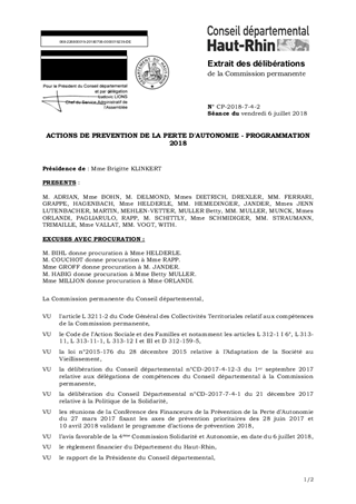 Suite à l'avis de la Conférence des Financeurs de la Prévention de la Perte d'Autonomie, installée par la loi du 28 décembre 2015, il vous est proposé de valider la programmation 2018. Celle-ci compte 232 actions pour un montant total de subvention à hauteur de 625 055 €. Cette dépense est entièrement couverte par une recette de la Caisse Nationale de Solidarité pour l'Autonomie.