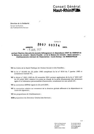 portant fixation des prix de journée hébergement et dépendance 2007 de l'EHPAD de la maison de retraite "Sainte Famille" et de la maison de retraite "Saint Antoine", établissements relevant de l'association "Louis Kremp" de RIBEAUVILLE. Resumé Pièces jointes ARRETE Assemblée : Non défini Date : 05/04/2007 Rapporteur : Non défini Collectivité : Conseil départemental du Haut-Rhin Direction : Non défini Service : Service de la Tarification des Etablissements Domaine : Prix de Journée Commission :