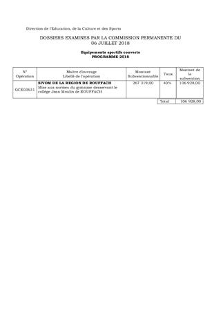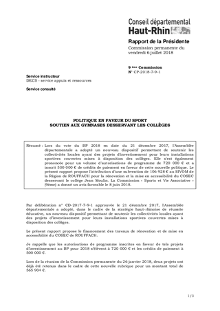 Lors du vote du BP 2018 en date du 21 décembre 2017, l'Assemblée départementale a adopté un nouveau dispositif permettant de soutenir les collectivités locales ayant des projets d’investissement pour leurs installations sportives couvertes mises à disposition des collèges. Elle s'est également prononcée pour un volume d'autorisations de programme de 720 000 € et a inscrit 500 000 € de crédits de paiement en faveur de cette nouvelle politique. Le présent rapport propose l’attribution d’une subvention de 106 928 € au SIVOM de la Région de ROUFFACH pour la rénovation et la mise en accessibilité du COSEC desservant le collège Jean Moulin. La Commission « Sports et Vie Associative » (9ème) a donné un avis favorable le 8 juin 2018.