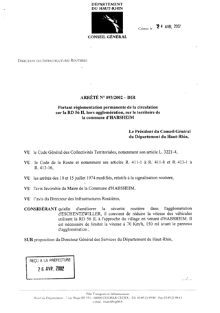 Portant réglementation permanente de la circulation sur la RD 56 II, hors agglomération, sur le territoire de la commune d'Habsheim Resumé Pièces jointes ARRETE Assemblée : Non défini Date : 24/04/2002 Rapporteur : Non défini Collectivité : Conseil départemental du Haut-Rhin Direction : Non défini Service : Service Administration et Finances Domaine : Circulation Commission :