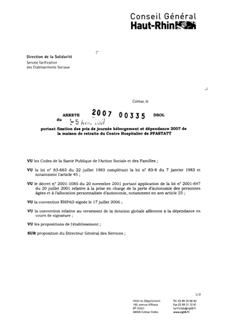 portant fixation des prix de journée hébergement et dépendance 2007 de la maison de retraite du centre hospitalier de PFASTATT. Resumé Pièces jointes ARRETE Assemblée : Non défini Date : 05/04/2007 Rapporteur : Non défini Collectivité : Conseil départemental du Haut-Rhin Direction : Non défini Service : Service de la Tarification des Etablissements Domaine : Prix de Journée Commission :