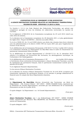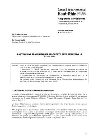 Dans le cadre du projet de partenariat transnational Véloroute Rhin - Eurovélo 15 (2018-2020), il est proposé : - d'attribuer à Alsace Destination Tourisme (ADT) un montant maximum de 4 920 € pour le portage administratif et financier de ce dossier pour le compte des deux Départements alsaciens, - d'approuver la convention de financement à intervenir entre ADT et le Département et d'autoriser la Présidente à la signer. Ce rapport a fait l'objet d'un avis favorable de la Commission Aménagement du Territoire et Tourisme en date du 8 juin 2018.