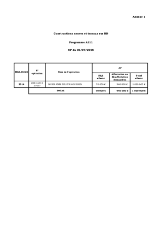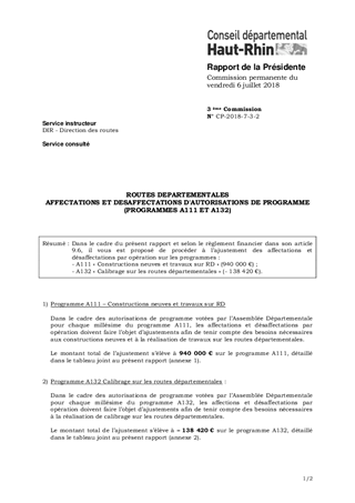Dans le cadre du présent rapport et selon le règlement financier dans son article 9.6, il vous est proposé de procéder à l’ajustement des affectations et désaffectations par opération sur les programmes : - A111 « Constructions neuves et travaux sur RD » (940 000 €) ; - A132 « Calibrage sur les routes départementales » (- 138 420 €).