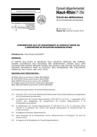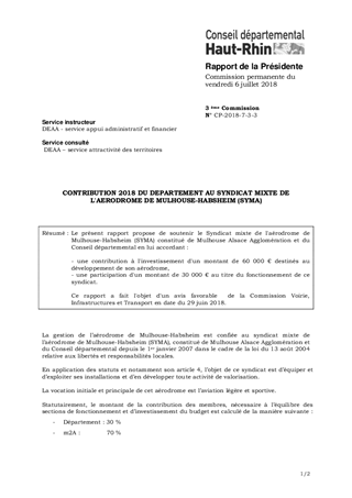 CONTRIBUTION 2018 DU DEPARTEMENT AU SYNDICAT MIXTE DE L'AERODROME DE MULHOUSE-HABSHEIM (SYMA)