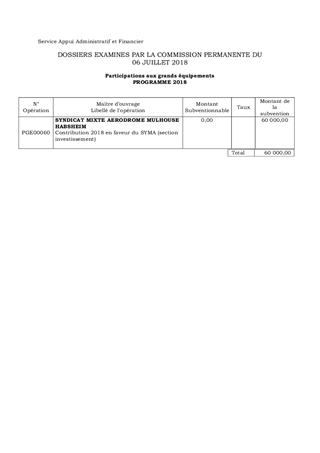 Le présent rapport propose de soutenir le Syndicat mixte de l'aérodrome de Mulhouse-Habsheim (SYMA) constitué de Mulhouse Alsace Agglomération et du Conseil départemental en lui accordant : - une contribution à l'investissement d'un montant de 60 000 € destinés au développement de son aérodrome, - une participation d'un montant de 30 000 € au titre du fonctionnement de ce syndicat. Ce rapport a fait l'objet d'un avis favorable de la Commission Voirie, Infrastructures et Transport en date du 29 juin 2018.
