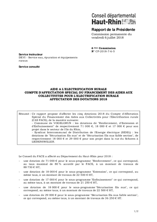 Ce rapport propose d'affecter les cinq dotations 2018 du Compte d'Affectation Spécial du Financement des Aides aux Collectivités pour l'Electrification rurale (CAS FACE), de la manière suivante: - Commune de VOGELGRUN : les dotations de "Renforcement, d'Extension et d'Enfouissement" de respectivement 71 000 €, 18 000 € et 17 000 € pour son projet dans le secteur de l'Ile du Rhin, - Syndicat Intercommunal de Distribution de l'Energie électrique (SIDEL) : les dotations de "Sécurisation fils nus" et de "Sécurisation fils nus faible section", de respectivement 18 000 € et 29 000 € pour son projet dans la rue du Schoren à LIEBENSWILLER.