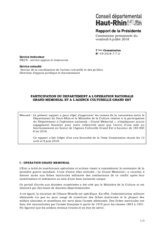 Le présent rapport a pour objet d’approuver les termes de la convention entre le Département du Haut-Rhin et le Ministère de la Culture relative à la participation du Département à l’opération nationale « Grand Mémorial », n’impliquant aucun engagement financier pour notre collectivité ainsi que l'octroi d'une aide au fonctionnement en faveur de l'Agence Culturelle Grand Est à hauteur de 180 000 € en 2018. Ce rapport a fait l’objet d’un avis favorable de la 7ème Commission réunie les 13 avril et 8 juin 2018.