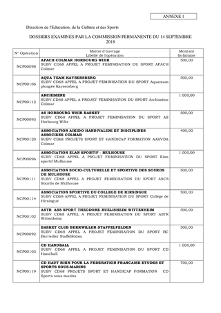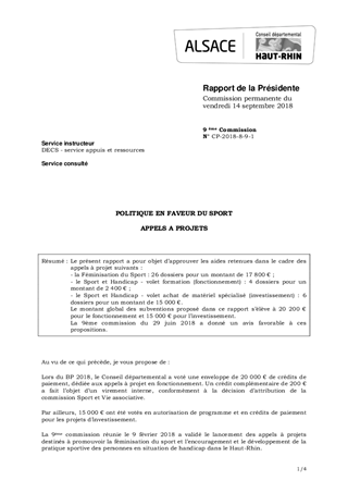 Le présent rapport a pour objet d’approuver les aides retenues dans le cadre des appels à projet suivants : - la Féminisation du Sport : 26 dossiers pour un montant de 17 800 € ; - le Sport et Handicap - volet formation (fonctionnement) : 4 dossiers pour un montant de 2 400 € ; - le Sport et Handicap - volet achat de matériel spécialisé (investissement) : 6 dossiers pour un montant de 15 000 €. Le montant global des subventions proposé dans ce rapport s’élève à 20 200 € pour le fonctionnement et 15 000 € pour l’investissement. La 9ème commission du 29 juin 2018 a donné un avis favorable à ces propositions.