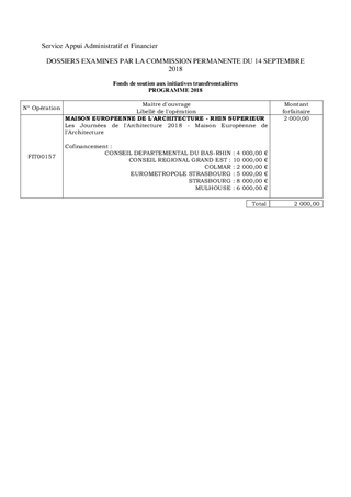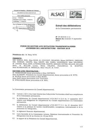 Dans le cadre du Fonds de soutien aux initiatives transfrontalières, il est proposé d’accompagner l’organisation des Journées de l’architecture 2018, portées par la Maison européenne de l’architecture, à hauteur de 2 000 euros. Ce rapport a fait l’objet d’un avis favorable de la Commission Actions, Relations Internationales et Promotion du Bilinguisme lors de sa réunion du 6 juillet 2018.