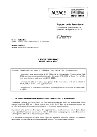 Dans le cadre du projet INTERREG V "Trois Pays à Vélo" , il est proposé : - d'attribuer une subvention de 23 579,80 € à l'Eurodistrict Trinational de Bâle (ETB), porteur administratif et financier du projet INTERREG V "Trois Pays à Vélo" pour une durée de trois ans, soit 2018-2021, - d'autoriser ETB à reverser une partie de la subvention, soit un montant de 2 436,80 €, à Saint-Louis Agglomération, - d'approuver la convention relative au présent projet et d'autoriser la Présidente à la signer.