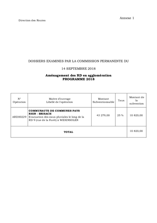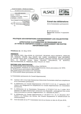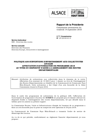 Attribution de subventions aux collectivités dans le domaine de la voirie. Affectation d'un montant de 10 820 € pour 1 dossier au titre de l’Aménagement des Routes Départementales au bénéfice de la Communauté de Communes Pays Rhin-Brisach. Cette subvention a fait l’objet d’un avis favorable de la 3ème Commission réunie le 29 juin 2018.