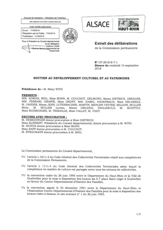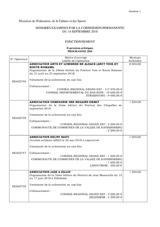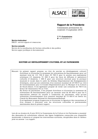 Le présent rapport propose, au titre du soutien au développement culturel, d'attribuer et d'autoriser le versement de subventions de fonctionnement pour un montant total de 131 700 € dont 39 700 € pour le soutien aux expressions artistiques (14 dossiers), 91 000 € pour les lieux de diffusion et opérateurs culturels (3 dossiers), 1 000 € pour une structure œuvrant pour la pratique musicale et vocale dans le cadre du Schéma Départemental des Enseignements Artistiques, ainsi qu'une subvention d'un montant maximal de 20 000 € au titre de l'investissement pour le Conseil Départemental pour la Musique et la Culture de Haute-Alsace. Il est également proposé de verser une cotisation de 700 € en faveur de l'Association Tôt ou T'Art. En faveur du patrimoine, il est proposé d'attribuer et d'autoriser le versement de subventions de fonctionnement pour un montant total de 85 000 € pour les 5 associations relevant du soutien à l'animation du patrimoine, ainsi qu'une subvention d'investissement d'un montant maximal de 75 000 € en faveur du Comité du Monument National du Hartmannswillerkopf. Il est également proposé d'approuver et d'autoriser la signature des conventions et d'un avenant à intervenir avec les structures culturelles et patrimoniales mentionnées dans le présent rapport.