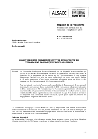 Le Volontariat Ecologique Franco-Allemand est un dispositif transfrontalier qui permet à des jeunes volontaires de découvrir le pays voisin en travaillant dans le domaine de la protection de la nature et de l’environnement. Il est proposé d’approuver l’accueil au sein de notre collectivité, et pour une durée limitée à 12 mois maximum, d’une jeune volontaire allemande pour participer à des travaux sur des thématiques de développement durable. Pour ce faire, il convient d’approuver les modalités de financement de cet accueil, à savoir, les versements d’une indemnité de 110 euros/mois à la jeune volontaire et d’une cotisation de 70 euros/mois pour l’association gestionnaire allemande. Il convient enfin d’approuver les termes de la convention à conclure avec la jeune volontaire et les deux organismes intermédiaires en charge de la mise en œuvre de ce dispositif, l’un allemand, l’autre français, ayant pour objet de préciser les engagements respectifs de chaque partie.