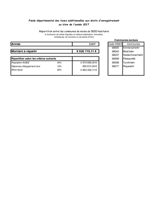 Il est proposé à votre Assemblée de répartir le montant de 9 926 719,11 € collecté en 2017 (en augmentation de 17,2 % par rapport à l’année 2016) au Fonds départemental de la taxe additionnelle aux droits d'enregistrement entre les communes de moins de 5 000 habitants.