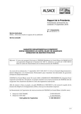 Il vous est proposé d’octroyer à l’EHPAD Résidence le Castel Blanc de MASEVAUX une garantie d’emprunt à hauteur de 100 %, relative à un prêt de 2 000 000 € dans le cadre du financement de la restructuration de l’EHPAD.