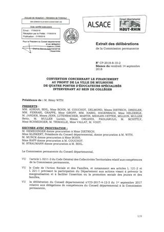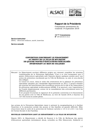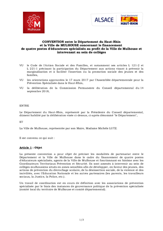 CONVENTION CONCERNANT LE FINANCEMENTAU PROFIT DE LA VILLE DE MULHOUSEDE QUATRE POSTES D'ÉDUCATEURS SPÉCIALISÉSINTERVENANT AU SEIN DE COLLÈGES