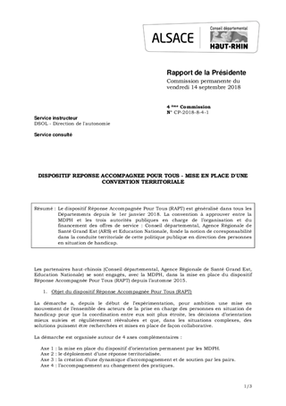 Le dispositif Réponse Accompagnée Pour Tous (RAPT) est généralisé dans tous les Départements depuis le 1er janvier 2018. La convention à approuver entre la MDPH et les trois autorités publiques en charge de l’organisation et du financement des offres de service : Conseil départemental, Agence Régionale de Santé Grand Est (ARS) et Education Nationale, fonde la notion de coresponsabilité dans la conduite territoriale de cette politique publique en direction des personnes en situation de handicap.