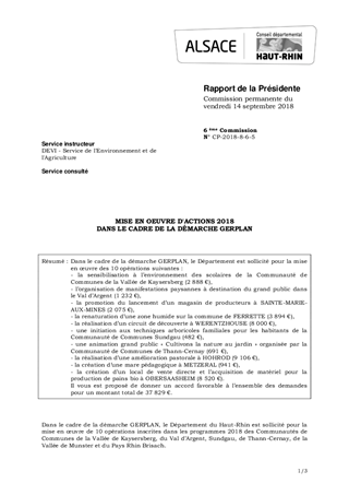 Dans le cadre de la démarche GERPLAN, le Département est sollicité pour la mise en œuvre des 10 opérations suivantes : - la sensibilisation à l’environnement des scolaires de la Communauté de Communes de la Vallée de Kaysersberg (2 888 €), - l’organisation de manifestations paysannes à destination du grand public dans le Val d’Argent (1 232 €), - la promotion du lancement d’un magasin de producteurs à SAINTE-MARIE-AUX-MINES (2 075 €), - la renaturation d’une zone humide sur la commune de FERRETTE (3 894 €), - la réalisation d’un circuit de découverte à WERENTZHOUSE (8 000 €), - une initiation aux techniques arboricoles familiales pour les habitants de la Communauté de Communes Sundgau (482 €), - une animation grand public « Cultivons la nature au jardin » organisée par la Communauté de Communes de Thann-Cernay (691 €), - la réalisation d’une amélioration pastorale à HOHROD (9 106 €), - la création d’une mare pédagogique à METZERAL (941 €), - la création d’un local de vente directe et l’acquisition de matériel pour la production de pains bio à OBERSAASHEIM (8 520 €). Il vous est proposé de donner un accord favorable à l’ensemble des demandes pour un montant total de 37 829 €.