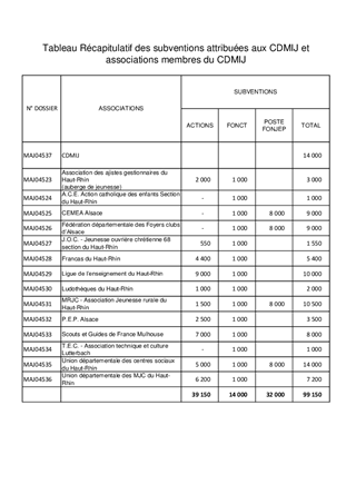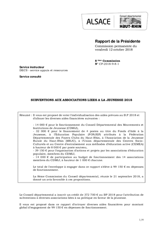 Il vous est proposé de voter l'individualisation des aides prévues au B.P 2018 et d’allouer les diverses aides financières suivantes : - 14 000 € pour le fonctionnement du Conseil Départemental des Mouvements et Institutions de Jeunesse (CDMIJ), - 32 000 € pour le financement de 4 postes au titre du Fonds d’Aide à la Jeunesse, à l’Education Populaire (FONJEP) attribués à la Fédération Départementale des Foyers Clubs du Haut-Rhin, à l’Association de la Jeunesse Rurale du Haut-Rhin (MRJC), à l’Union départementale des Centres Socio-Culturels et au Centre d’entraînement aux méthodes d’éducation active (CEMEA) à hauteur de 8 000 € par poste soutenu, - 39 150 € pour l’organisation d’actions et projets par les associations d’éducation populaire, membres du CDMIJ, - 14 000 € de participation au budget de fonctionnement des 14 associations membres du CDMIJ, à hauteur de 1 000 € chacune. Le total de l'enveloppe à engager dans ce rapport s'élève à 99 150 € en dépenses de fonctionnement. La 8ème Commission du Conseil départemental, réunie le 21 septembre 2018, a donné un avis favorable à ces propositions.