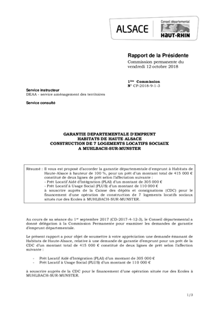 GARANTIE DEPARTEMENTALE D'EMPRUNTHABITATS DE HAUTE ALSACECONSTRUCTION DE 7 LOGEMENTS LOCATIFS SOCIAUXA MUHLBACH-SUR-MUNSTER