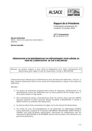 Le présent rapport a pour objet la désignation d'un 5ème représentant du Département pour siéger au sein de l'Association "le Cap" à MULHOUSE.