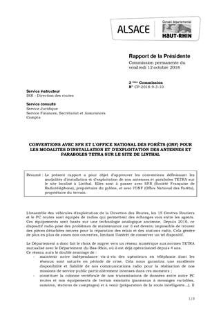 Le présent rapport a pour objet d'approuver les conventions définissant les modalités d'installation et d'exploitation de nos antennes et paraboles TETRA sur le site localisé à Linthal. Elles sont à passer avec SFR (Société Française de Radiotéléphone), propriétaire du pylône, et avec l’ONF (Office National des Forêts), propriétaire du terrain.