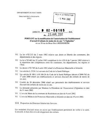 Portant sur la modification de l'autorisation de l'établissement d'accueil d'enfants de moins de six ans L'Eglantine Resumé Pièces jointes ARRETE Assemblée : Non défini Date : 25/04/2002 Rapporteur : Non défini Collectivité : Conseil départemental du Haut-Rhin Direction : Non défini Service : Service de Protection Maternelle et Infantile Domaine : Accueil d'enfants Commission :