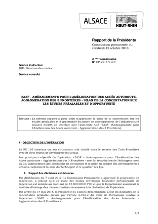 Le présent rapport a pour objet d'approuver le bilan de la concertation sur les études préalables et d'opportunité du projet de développement de l'infrastructure routière RD105 en interface avec l'autoroute A35 "5A3F" (Aménagements pour l'Amélioration des Accès Autoroute - Agglomération des 3 Frontières).