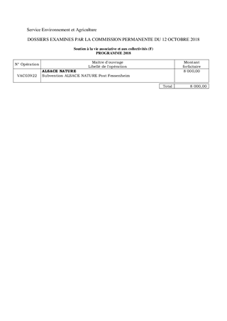 Le présent rapport est relatif à la demande présentée par l'association ALSACE NATURE dans le cadre de sa contribution aux opérations d’accompagnement des projets « post-Fessenheim " et au titre du programme d'actions 2018 de la politique de soutien à la vie associative. Il est proposé une aide de 8 000 €.